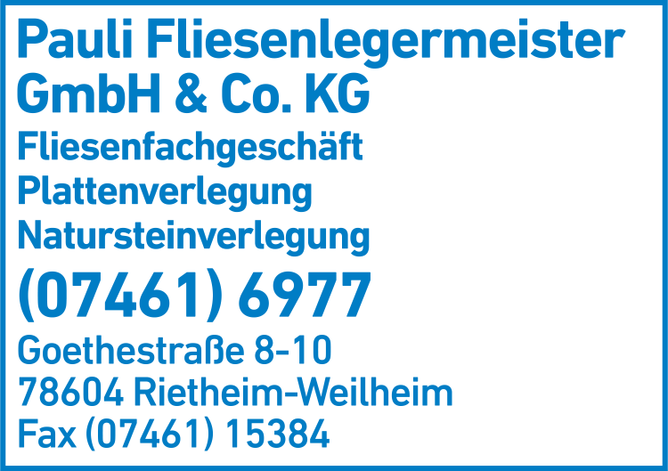 Die Adresse von Pauli Fliesenlegermeister GmbH & Co. KG lautet: Goethestr. 8-10, 78604 Rietheim-Weilheim