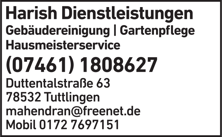 Die Adresse von Harish Dienstleistungen Gebäudereinigung lautet: Duttentalstr. 63, 78532 Tuttlingen