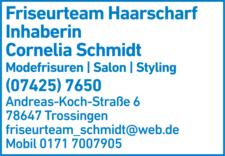 Die Adresse von Friseurteam Haarscharf Inh. Cornelia Schmidt lautet: Andreas-Koch-Str. 6, 78647 Trossingen