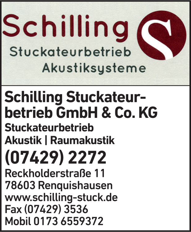 Die Adresse von Schilling Stuckateurbetrieb GmbH & Co. KG lautet: Reckholderstr. 11, 78603 Renquishausen