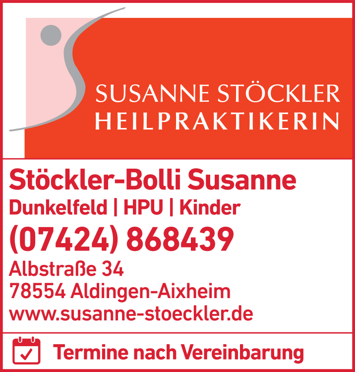 Die Adresse von Stöckler-Bolli Susanne Heilpraktikerin lautet: Albstr. 34, 78554 Aldingen