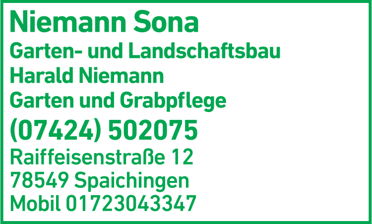 Die Adresse von Niemann Sona Garten- und Landschaftsbau Harald Niemann lautet: Raiffeisenstr. 12, 78549 Spaichingen