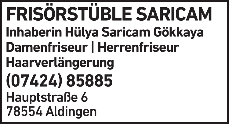 Die Adresse von Frisörstüble Saricam Inh. Hülya Saricam Gökkaya lautet: Hauptstr. 6, 78554 Aldingen