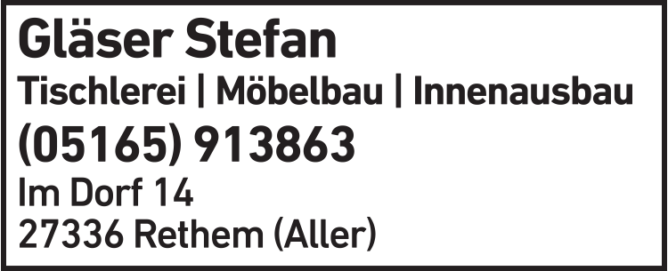 Die Adresse von Gläser Stefan Tischlerei lautet: Im Dorf 14, 27336 Rethem (Aller)