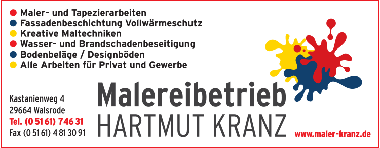 Die Adresse von Kranz Hartmut Malerbetrieb lautet: Kastanienweg 4, 29664 Walsrode