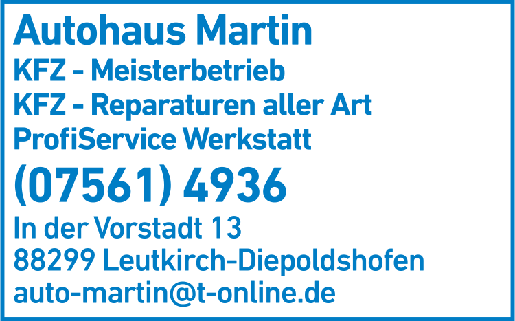 Die Adresse von Autohaus Martin KFZ-Meisterbetrieb - ProfiService Werkstatt Reparaturen aller Art lautet: In der Vorstadt 13, 88299 Leutkirch-Diepoldshofen