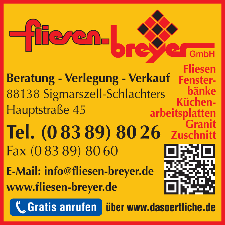 Die Adresse von Fliesen Breyer GmbH lautet: Hauptstr. 45, 88138 Sigmarszell
