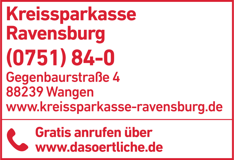 Die Adresse von Kreissparkasse Ravensburg lautet: Gegenbaurstr. 4, 88239 Wangen