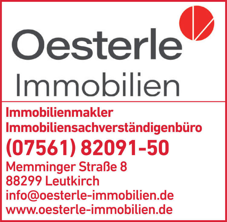 Die Adresse von Oesterle Immobilien GmbH Immobilienmakler & Sachverständigenbüro lautet: Memminger Str. 8, 88299 Leutkirch