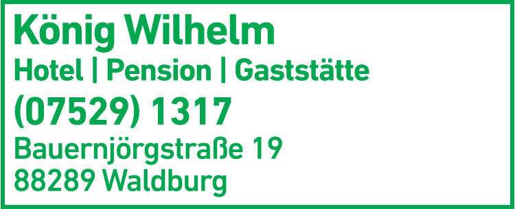 Die Adresse von Hotel König Wilhelm Pension, Gaststätte lautet: Bauernjörgstr. 19, 88289 Waldburg