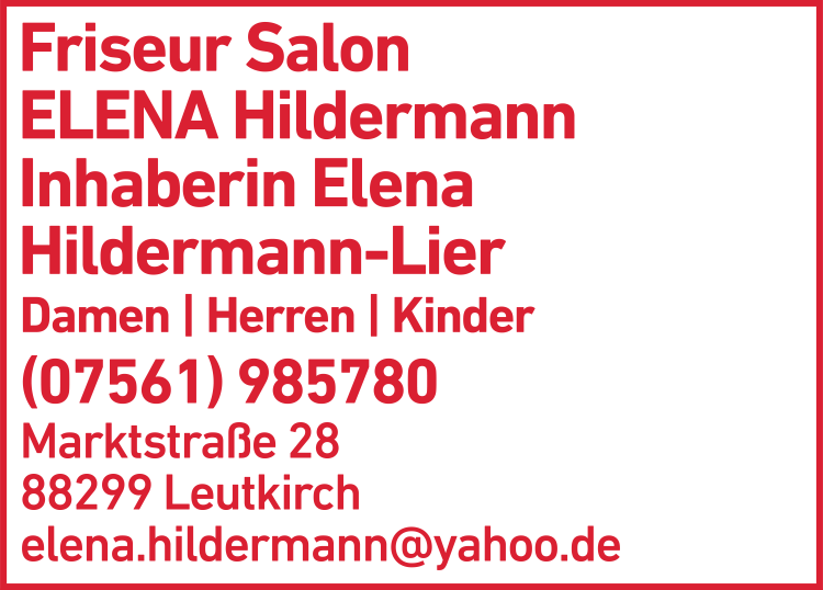 Die Adresse von Friseur Salon Elena Hildermann-Lier lautet: Marktstr. 28, 88299 Leutkirch