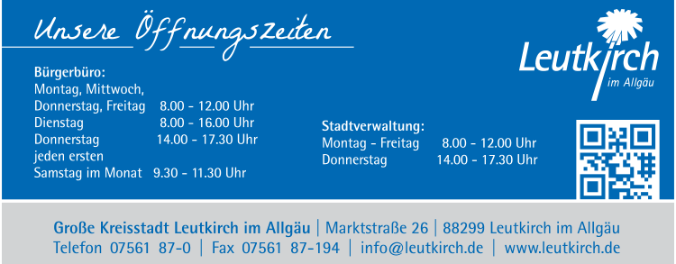 Große Kreisstadt Leutkirch im Allgäu hat montags bis mittwochs von 08:00 - 12:00 Uhr, donnerstags von 08:00 - 12:00 Uhr und 14:00 - 17:30 Uhr und freitags von 08:00 - 12:00 Uhr geöffnet.