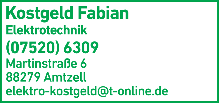 Die Adresse von Kostgeld Fabian Elektrogeschäft lautet: Martinstr. 6, 88279 Amtzell