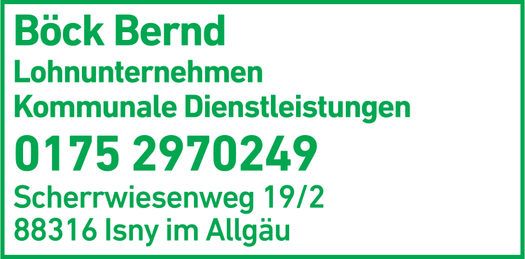 Böck Bernd Lohnunternehmen u. kommunale Dienstleistungen 0175 2 97 02 49 Isny Scherrwiesenweg 19/2 88316