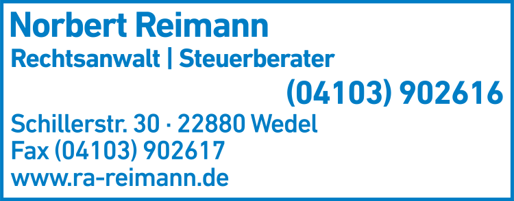 Die Adresse von Reimann Norbert Steuerberater lautet: Schillerstr. 30, 22880 Wedel