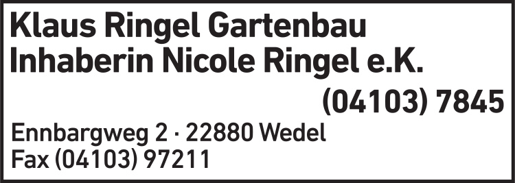 Die Adresse von Klaus Ringel Garten- und Landschaftsbau Inh. Nicole Ringel e.K. lautet: Ennbargweg 2, 22880 Wedel