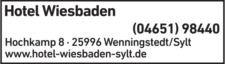 Die Adresse von Hotel Wiesbaden lautet: Hochkamp 8, 25996 Wenningstedt-Braderup (Sylt)