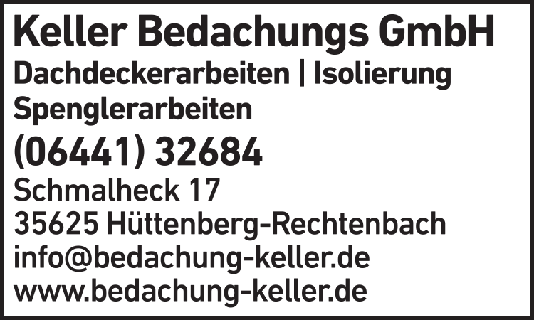 Die Adresse von Keller Bedachungs GmbH lautet: Schmalheck 17, 35625 Hüttenberg-Rechtenbach