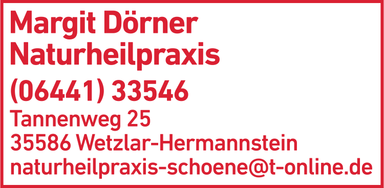 Die Adresse von Naturheilpraxis Margit Dörner lautet: Tannenweg 25, 35586 Wetzlar-Hermannstein