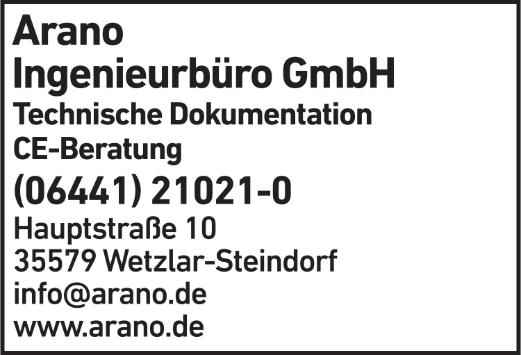 Die Adresse von Arano GmbH lautet: Hauptstr. 10, 35579 Wetzlar-Steindorf