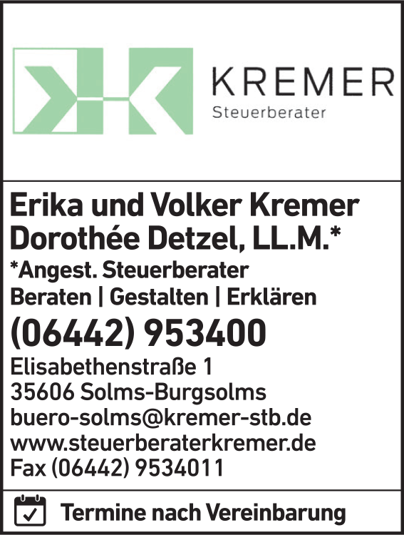 Die Adresse von Kremer Erika Steuerberater lautet: Elisabethenstr. 1, 35606 Solms