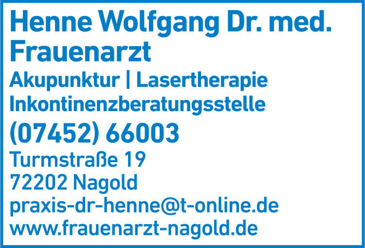 Die Adresse von Henne Wolfgang Dr. med. Frauenarzt lautet: Turmstr. 19, 72202 Nagold