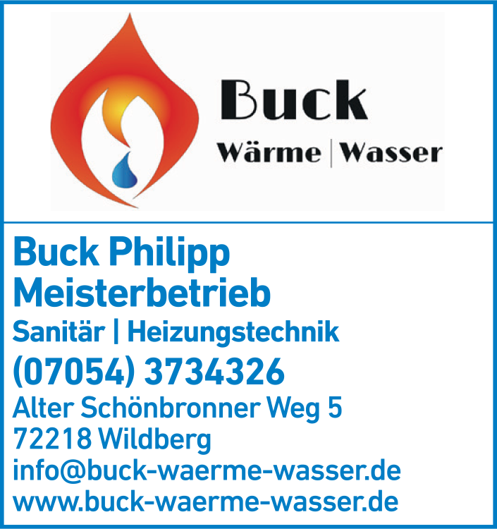 Die Adresse von Buck Philipp Wärme - Wasser lautet: Alter Schönbronner Weg 5, 72218 Wildberg