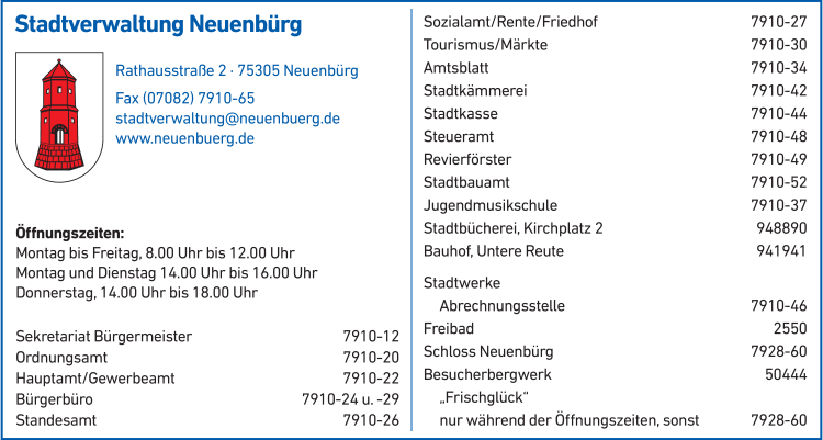 Stadtverwaltung Neuenbürg hat montags bis dienstags von 08:00 - 12:00 Uhr und 14:00 - 16:00 Uhr, mittwochs von 08:00 - 12:00 Uhr, donnerstags von 08:00 - 12:00 Uhr und 14:00 - 18:00 Uhr und freitags von 08:00 - 12:00 Uhr geöffnet.