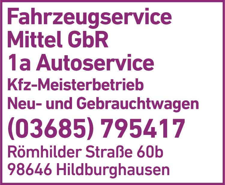 Wie lautet die Adresse von 1a Fahrzeugservice Mittel GbR Inh. Lars Ramsthaler & Sebastian Wiederra Kfz-Werkstatt?