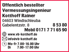 Die Adresse von Öffentlich bestellter Vermessungsingenieur Kotthoff Rainer lautet: Gabelentzstr. 8, 04603 Windischleuba