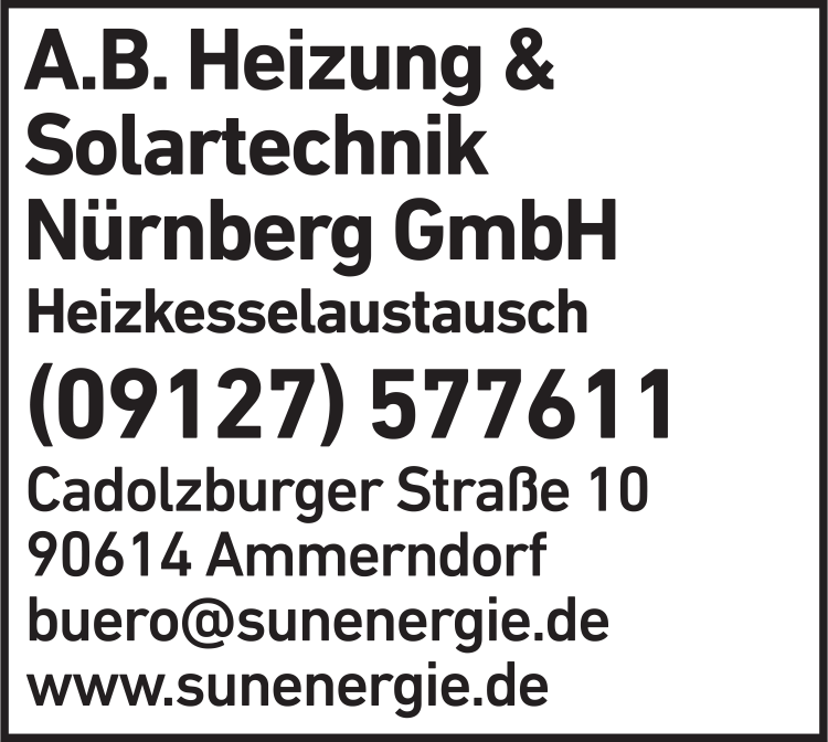A.B. Heizung & Solartechnik Nürnberg GmbH 09127 57 76 11 Ammerndorf Cadolzburger Str. 10 90614