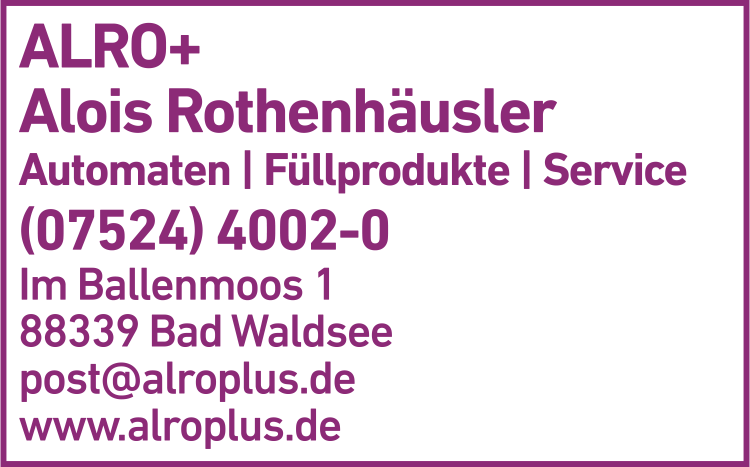 Die Adresse von ALRO+ Automaten-Service lautet: Im Ballenmoos 1, 88339 Bad Waldsee