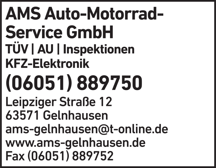 Die Adresse von AMS Auto-Motorrad-Service GmbH lautet: Leipziger Str. 12, 63571 Gelnhausen-Roth