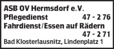 ASB OV Hermsdorf e.V. bietet Pflegedienst, Fahrdienst, Essen auf Rädern und Pflegedienste an.