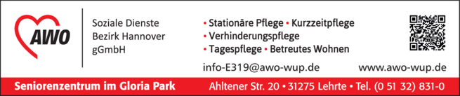 Die AWO Soziale Dienste Bezirk Hannover gGmbH bietet vielfältige Leistungen für Pflegebedürftige und Senioren an und hat sich auf die Bereiche Wohnen und Pflege spezialisiert. Im Seniorenzentrum und der Wohnanlage des Unternehmens wird Ihnen die Chance auf ein betreutes Wohnen ermöglicht. Dabei werden Sie von den Pflegern des Unternehmens ganz nach Ihren persönlichen Bedürfnissen mit den von Ihnen benötigten Pflegeleistungen in Ihrem Alltag unterstützt. Darüber hinaus bietet der soziale Dienst der AWO eine stationäre Pflege sowie eine Tagespflege oder Kurzzeitpflege an. Außerdem werden von der AWO ambulante Dienstleistungen angeboten, die Sie bei der Bewältigung Ihres Alltages in Ihren gewohnten vier Wänden unterstützen sollen. |