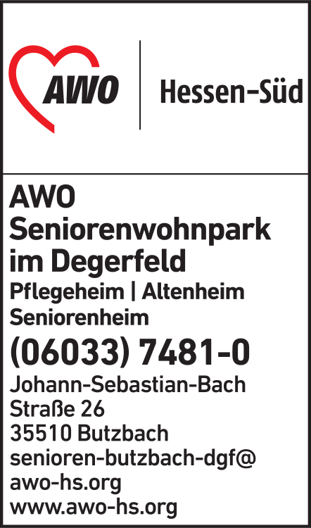 Die Adresse von AWO Seniorenwohnpark im Degerfeld lautet: Johann-Sebastian-Bach-Str. 26, 35510 Butzbach