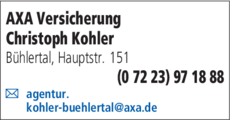 AXA Versicherung Kohler Christoph 07223 97 18 88 Bühlertal Hauptstr. 151 77830