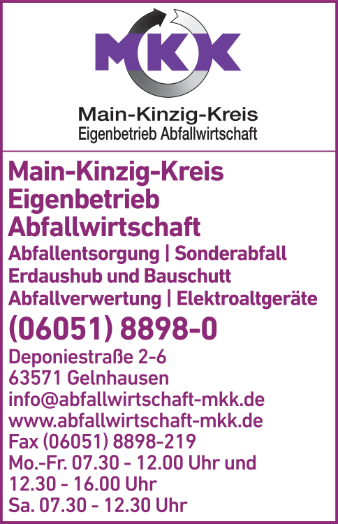 Abfallwirtschaft Main-Kinzig-Kreis Eigenbetrieb hat montags bis freitags von 07:30 - 12:00 Uhr und 12:30 - 16:00 Uhr und samstags von 07:30 - 12:30 Uhr geöffnet.