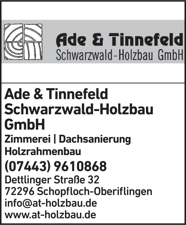 Die Adresse von Ade & Tinnefeld Schwarzwald-Holzbau GmbH lautet: Dettlinger Str. 32, 72296 Schopfloch