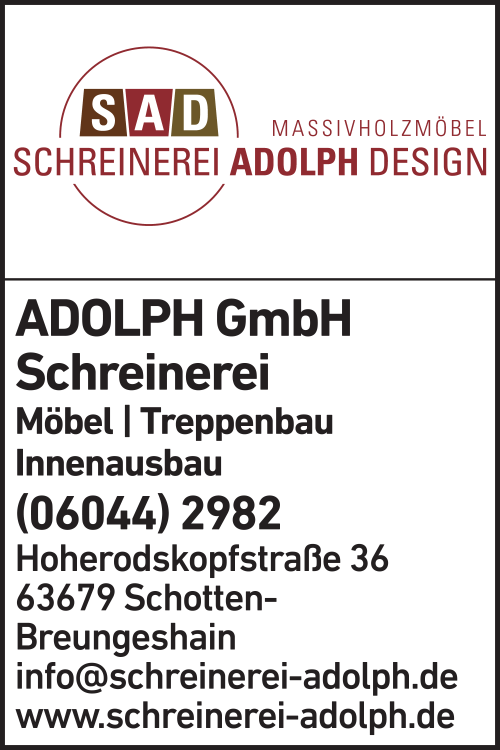 Die Adresse von Adolph GmbH Schreinerei Massivholzmöbel lautet: Hoherodskopfstr. 36, 63679 Schotten-Breungeshain