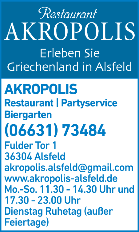 Die Adresse von Akropolis Griechisches Restaurant lautet: Fulder Tor 1, 36304 Alsfeld