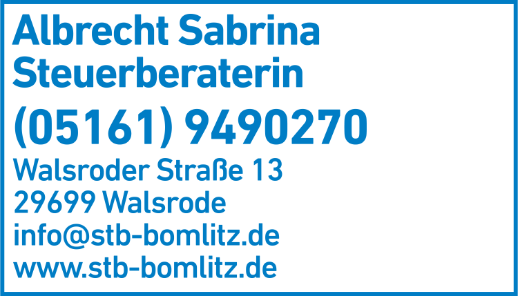 Die Adresse von Albrecht Sabrina Steuerberaterin lautet: Walsroder Str. 13, 29699 Walsrode