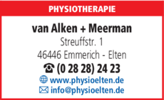 Die Adresse von Alken van & Meerman Physiotherapie lautet: Streuffstr. 1, 46446 Emmerich am Rhein