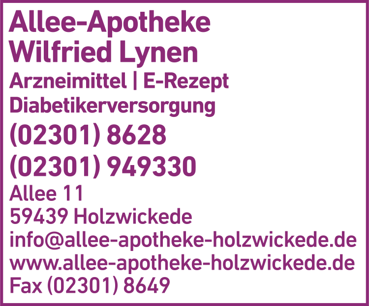 Die Adresse von Allee-Apotheke Wilfried Lynen lautet: Allee 11, 59439 Holzwickede