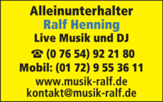 Alleinunterhalter Stegerer Ralf H. 07654 92 21 80 Friedenweiler Rohrstr. 10 79877 Rötenbach 5 5 1