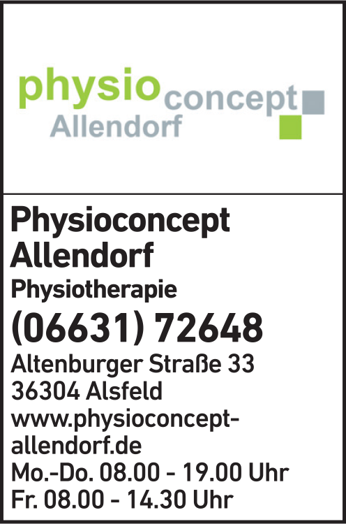 Die Adresse von Allendorf Physioconcept Allendorf lautet: Altenburger Str. 33, 36304 Alsfeld
