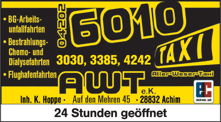 Die Adresse von Aller-Weser-Taxi e.K. lautet: Au den Mehren 45, 28832 Achim