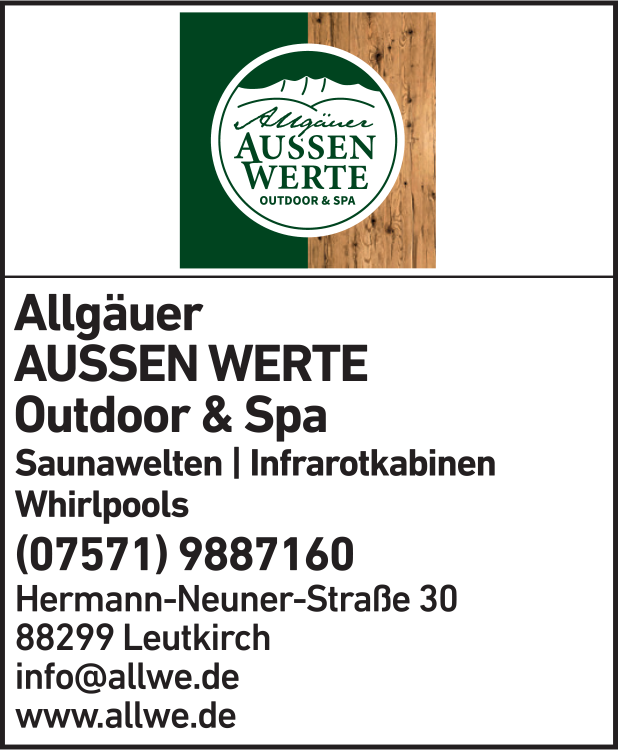 Die Adresse von Allgäuer Aussen-Werte Outdoor & Spa GmbH lautet: Hermann-Neuner-Str. 30, 88299 Leutkirch