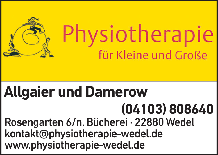 Die Adresse von Allgaier und Damerow Physiotherapie lautet: Rosengarten 6, 22880 Wedel