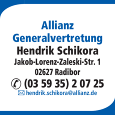 Die Adresse von Allianz Generalvertretung Hendrik Schikora lautet: Jakob-Lorenz-Zaleski-Str. 1, 02627 Radibor